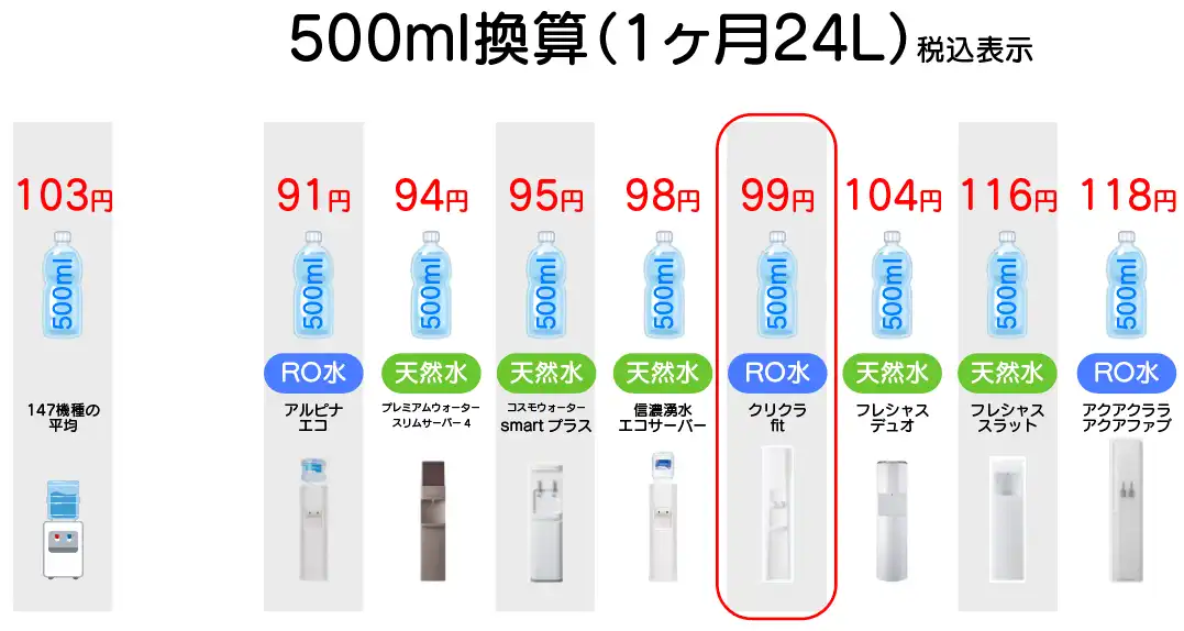 ・月額料金と500ml換算は1ヶ月に24L使用した場合の電気代、レンタル料、サービス料、消費税の合計