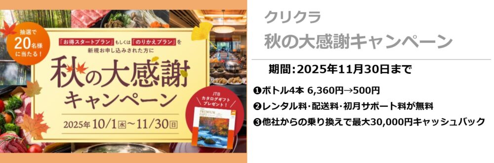 注文ノルマも無いため必要な時に必要なだけ、無駄なく利用することができます(3ヶ月で利用本数が6本未満の場合はレンタル料1,100円が必要)。 手軽にサーバーをはじめたい方クリクラはトップブランドではめずらしく、完全無料でお試しレンタルができるメーカーです。無料お試しは2025年に廃止されました