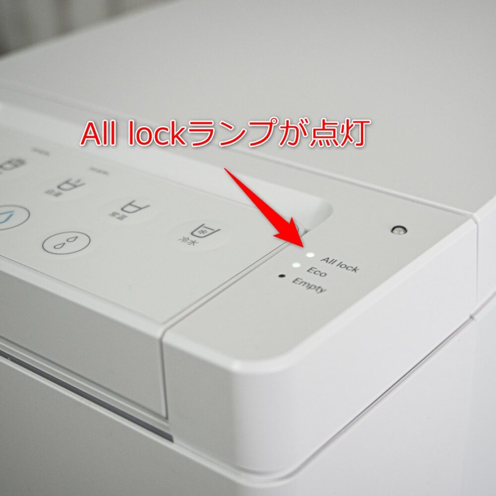 後で気付いたんですが、実はこのLEDランプは消すことができます。白湯ボタンと温水ボタンの同時長押し(7秒間)で、ランプのONとOFFが切り替えられます。